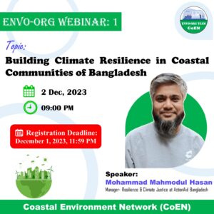 Mark your calendars for the Envo-Org Webinar on “Building Climate Resilience in Coastal Communities of Bangladesh” featuring Mr. Mohammad Mahmodul